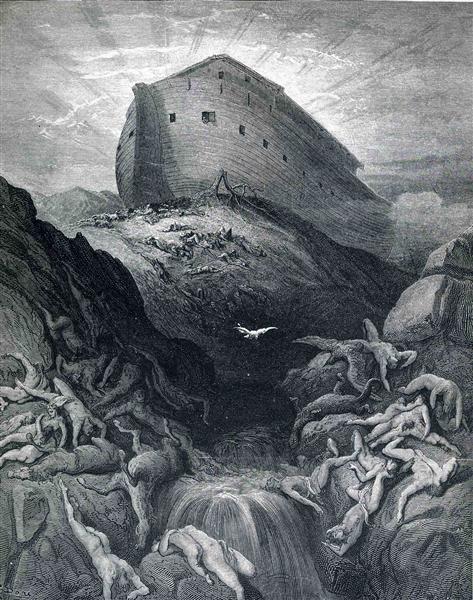 Scanning the terraformed landscape of a post diluvian world, the most striking feature that may have caught Noah’s eye was the corpses of man and animal strewn about, bloated and pale, and beginning to smell. Far from the typical Sunday school artistry, the actual remnants of the flood had a lot more silt and boggy ground, and considerably fewer smiling animals. And over that world shaved clean of growing things, a bow bent in the sky, a colorful spectacle juxtaposing the canvas of the world splotchy with shades of beige and still wet.