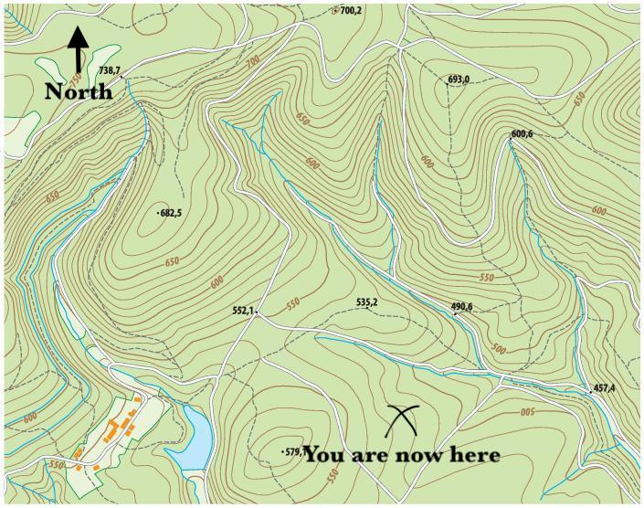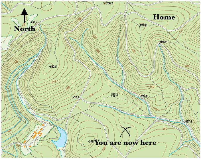 The skill of orientation is when you use your compass to orient yourself and the map to coincide with the landscape; you want yourself, your map and the landscape all pointing in the same direction. Then you can look find the prominent features of your surroundings, find the corresponding shapes on the map, and triangulate your approximate position. If you see a very steep cliff off to your left and right, and a river running up the middle, you can find an area on the map where the tight contour lines straddle a river and there you are. You are no longer lost. Now all you need to do is navigate to the destination on the map, to home.