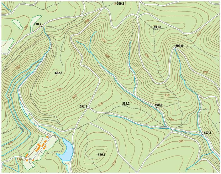 Below you have a topographic map. If you are not familiar with these, they are pretty simple. The brown lines are called contour lines and indicate altitude, which is denoted by the number. The tighter the altitude lines are to each other, the steeper the mountain or slope. Lines that are spread out indicate flatter areas, good camping spots. Blue is water. Other features can be deduced from the how the contour lines swerve and stretch.